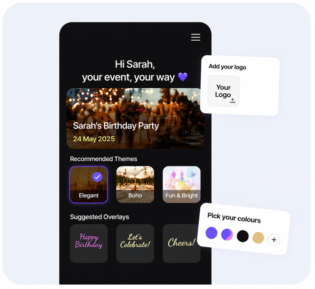 Pick from our range of overlay templates (the design on all your photos and videos), or go bespoke and let us create something completely unique to your event.